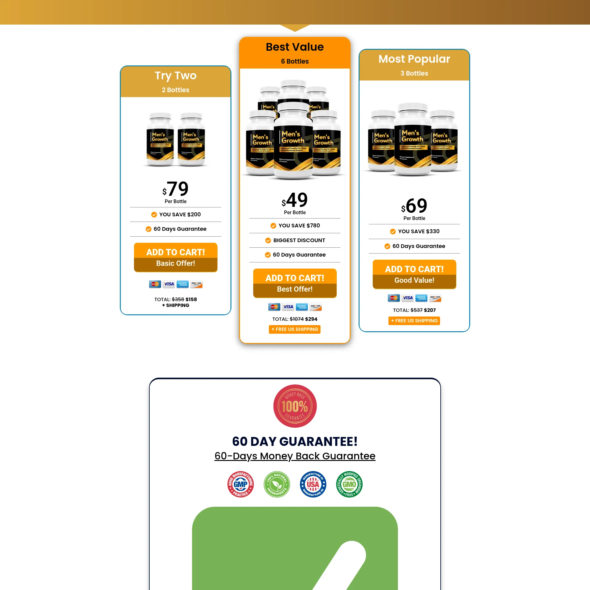 Men's Growth : Advanced Formula For Libido & Performance Support Men’s Growth is a male enhancement supplement specifically formulated to address various issues related to sexual health and performance. Unlike other products that rely on synthetic ingredients or hormones, this supplement uses a blend of natural ingredients aimed at enhancing your body’s processes. Rather than masking symptoms like many synthetic alternatives, Men’s Growth works at the root—restoring hormonal harmony that influences not just your libido but also your muscle tone, mental sharpness, and overall vitality. Claim Your Discounted Men's Growth Below While Stocks Last Why Choose Men's Growth? Made In USA This supplement is formulated in the United States of America. 100% Natural We are proud to say that This Formula is All Natural, Non-GMO and Gluten-Free. GMP Certified Good Manufacturing Practice certified ensuring pharmaceutical grade quality FDA Approved This supplement is formulated in a FDA registered facility which adheres to strict FDA. What is Men's Growth? Men's Growth is a dietary supplement formulated to enhance male performance and vitality. It combines traditional herbal wisdom with modern science to support overall male health. The supplement is specifically designed for men experiencing a decline in energy, libido, or overall vitality. It’s suitable for those seeking a natural boost to their performance and well-being. Men's Growth is particularly beneficial for men over 40 who may be noticing a decrease in stamina and energy levels. However, younger men looking to maintain peak performance can also benefit. Does Men's Growth Work? The efficacy of Men’s Growth lies in its carefully selected ingredients and their synergistic effects. Numerous studies suggest that the key ingredients in this supplement have beneficial properties that can significantly improve male health. For instance, Epimedium has been linked to increased testosterone levels, which can lead to improved energy and muscle performance. Eurycoma Longifolia is known for its potential to enhance physical endurance and recovery time, making it a popular choice among athletes. Saw Palmetto contributes to prostate health and hormonal balance, while Sarsaparilla and Wild Yam are recognized for their detoxifying and hormone-regulating properties. Together, these ingredients create a powerful formula that addresses various aspects of male health. Many users have reported noticeable improvements in their energy levels, physical performance, and overall well-being after incorporating Men’s Growth into their daily routine. It is important to note that results may vary depending on individual lifestyles, including diet and exercise. However, when combined with a balanced diet and regular physical activity, Men’s Growth can be a highly effective supplement that supports long-term health and fitness goals. Advantages Of Men's Growth Supplement Men's Growth is a natural health supplement that provides you with numerous health benefits. Some of the main benefits that you can expect from regular use of the supplement are given below: Men's Growth has been proven to improve sex drive and help to boost libido in men. It helps enhance blood circulation, which leads to an increase in sexual performance. It improves sleep, reduces anxiety and stress, and boosts energy levels. It promotes healthier and sustainable erectile health in men. It reduces the downtime to get erections after ejaculation. The added ingredients in this product are purely sourced from nature’s extract. This supplement is intended to boost men’s testosterone production. It is a GMO-free product where there are no added fillers or preservatives. This product comes with an ironclad 60-day money back guarantee. This supplement is produced in an FDA-registered and GMP-certified facility in the USA. Customer Reviews Tom S. - California, USA ⭐⭐⭐⭐⭐ Verified Purchase "As someone sensitive to synthetic stimulants, Men's Growth's plant-based formula was perfect. Gradual improvements over 8 weeks - better sleep, morning vitality, and overall confidence. No jitters or crashes." Steven D. - Virginia, USA ⭐⭐⭐⭐⭐ Verified Purchase “I’ve been using Men's Growth for a month now, and I’ve definitely noticed an improvement in my energy levels and workout endurance. I feel more motivated and can push through my routines with ease. Highly recommend it!” Ryan H. - Texas, USA ⭐⭐⭐⭐⭐ Verified Purchase "Initially tried Men's Growth for energy support but noticed improvements in multiple areas - sleep quality, workout performance, and overall vitality. The 60-day guarantee made trying it risk-fr Ryan H. - Texas, USA ⭐⭐⭐⭐⭐ Verified Purchase "Initially tried Men's Growth for energy support but noticed improvements in multiple areas - sleep quality, workout performance, and overall vitality. The 60-day guarantee made trying it risk-fr Men's Growth Ingredients Below we have discussed the core ingredients present in the supplement in detail: Scientifically Formulated FDA Approved Facility processed under strict sterile standards with regularly disinfected equipment 100% All Natural with ingredients sourced from local growers that let plants naturally reach their full maturity and use no chemical treatments Money Back Guarantee Our investment is covered by a 60-Day, 100% Money-Back GUARANTEE. Key Benefits of Men's Growth Supplement Improves sexual performance and libido – The supplement enhances desire, arousal, and stamina in intimate moments. It helps restore confidence and satisfaction in relationships. Boosts energy and stamina – By enhancing hormonal balance and circulation, it increases overall vitality. Users experience reduced fatigue and better physical performance throughout the day. Increases natural testosterone levels – Men's Growth supports the body’s hormone production system. This helps combat age-related testosterone decline saf